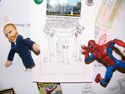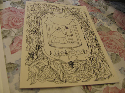 So I was honored when asked to do the wedding invitation cover for my sister's wedding. The wedding's on Sunday and I'm taking off tomorrow morning, so I figured in that spirit I'd post about the evolution of that cover. After asking, she sent me these invitations as a jumping off point.