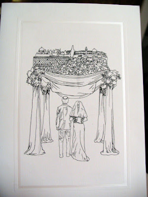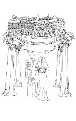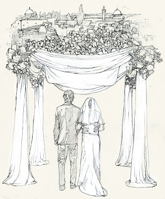 I decided to go with a little bit less playful, less cartoony style-and we went back and forth with emails of the pic. I scanned the web for reference of Jerusalem, flowers, and brides/grooms, and put something together that worked. I then basically went exactly off of that.